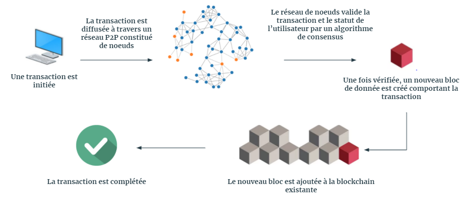 Nous pouvons illustrer de manière simplifiée une transaction sur la blockchain de la manière suivante :