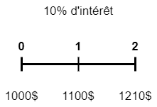 Par exemple, si vous avez 1000$ que vous placez durant deux ans avec 10% d’intérêt alors :